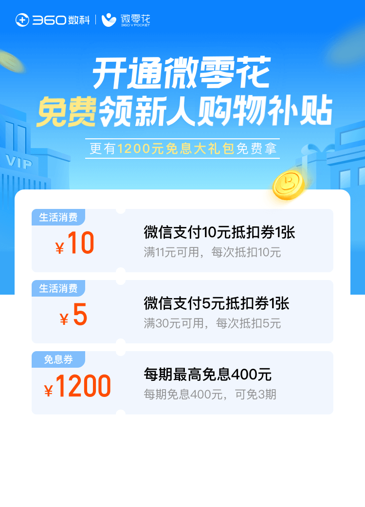 3. 新用户通过此活动页成功开通微零花后,即可自动获得价值15元购物补贴和总价1200元免息券大礼包,购物补贴包含:微信支付10元抵扣券1张,消费满11元可用,每次使用抵扣10元;微信支付5元抵扣券1张,消费满30元可用,每次使用可抵扣5元。总价1200元免息券大礼包包含:微零花400元免息券,每期最高免息400元,最高可免3期。